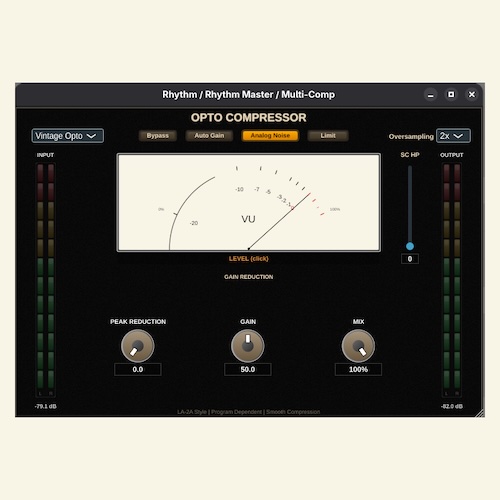 - OptoやFETモードでは、それぞれのハードウェアの倍音特性や歪み感を再現