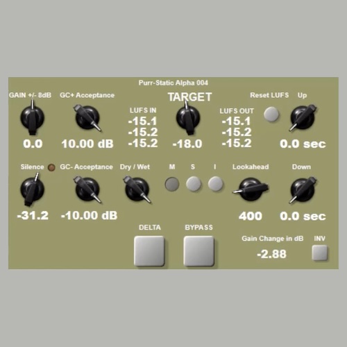 Purr-Static alpha 004は、音量調整を自動化しながら自然なサウンドを維持できるラウドネスライダープラグインです。