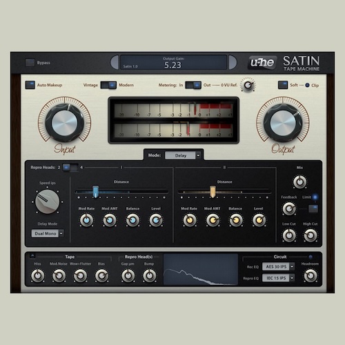 u-he「Satin」入力・出力レベル調整大型ノブとVU・ピークメーター搭載!プロ用クラシック・テープマシンから安価でナスティーなマシン・テープディレイ・フランジング・コーラスまで再現する高精度なテープシミュレーター